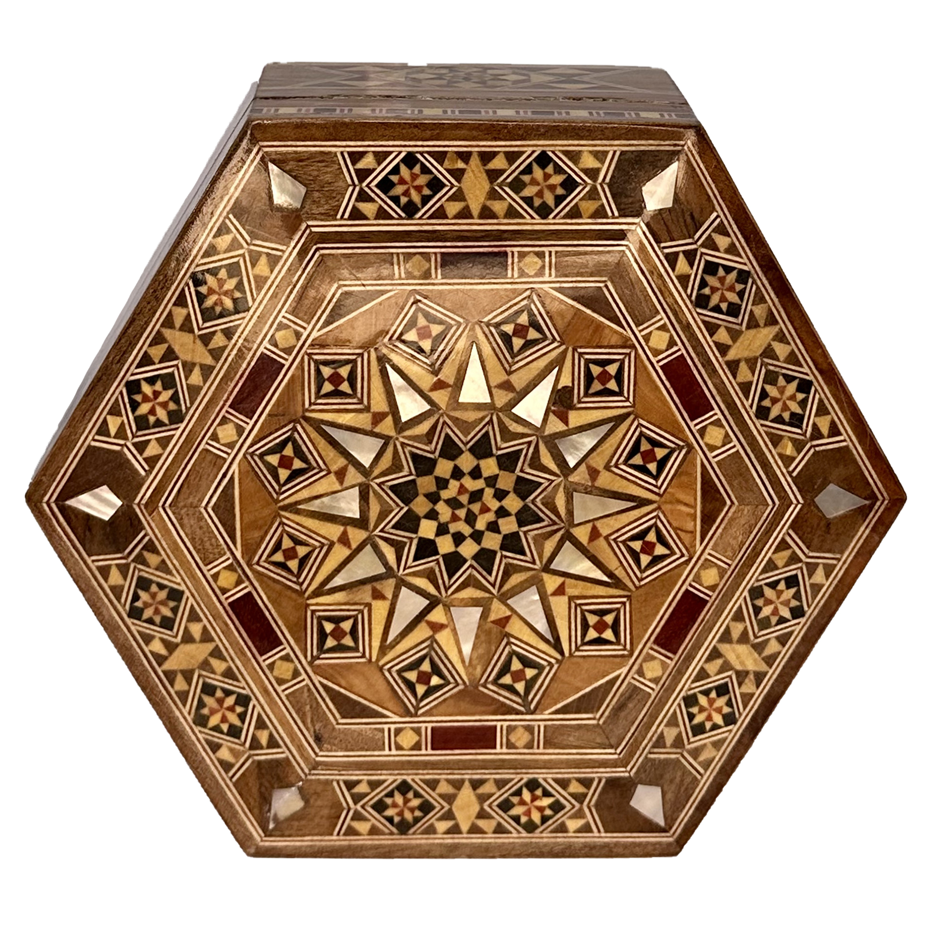 En Syrie, la fabrication des boîtes en mosaïque est un art traditionnel raffiné, transmis de génération en génération, notamment à Damas. Ces boîtes sont faites à la main à partir de bois précieux comme le noyer, le citronnier ou le bois de rose. Les artisans y incrustent de petites pièces de nacre et de bois colorés pour créer des motifs géométriques complexes appelés “moucharabieh”. Chaque pièce est soigneusement taillée, polie, puis assemblée avec précision pour former un décor harmonieux. Ces boîtes, souvent utilisées pour ranger des bijoux ou des objets précieux, sont un symbole du riche artisanat syrien et de son savoir-faire unique.