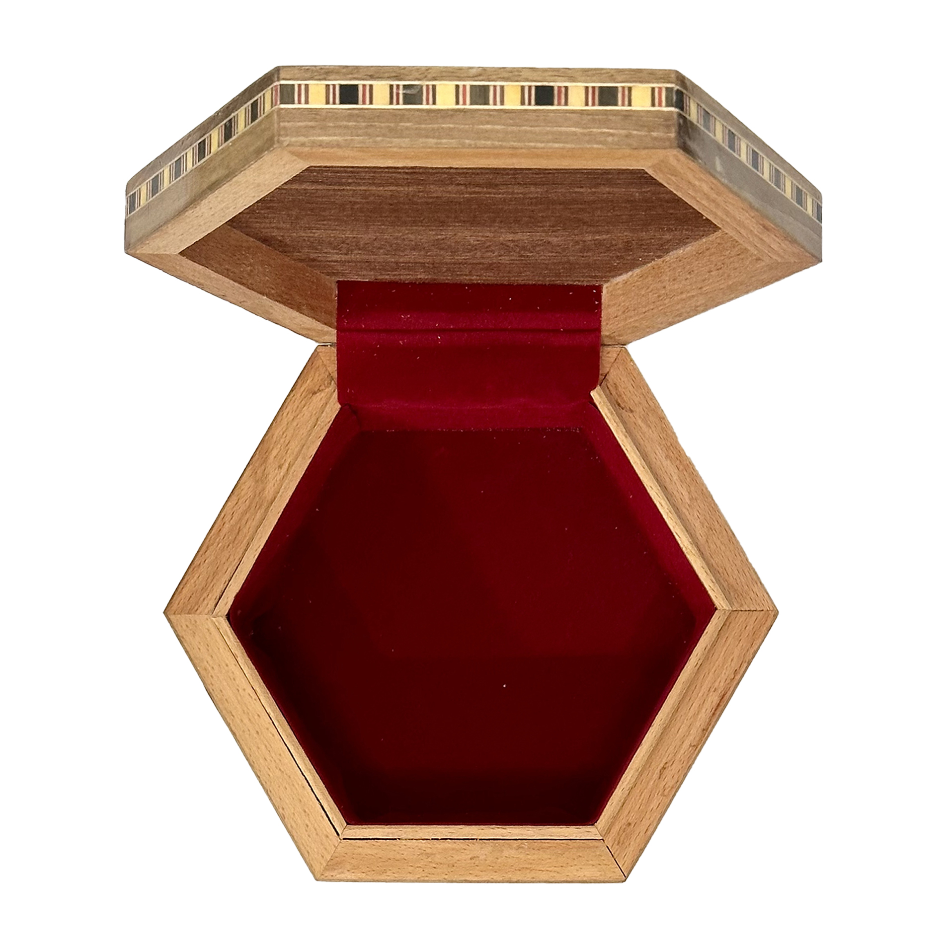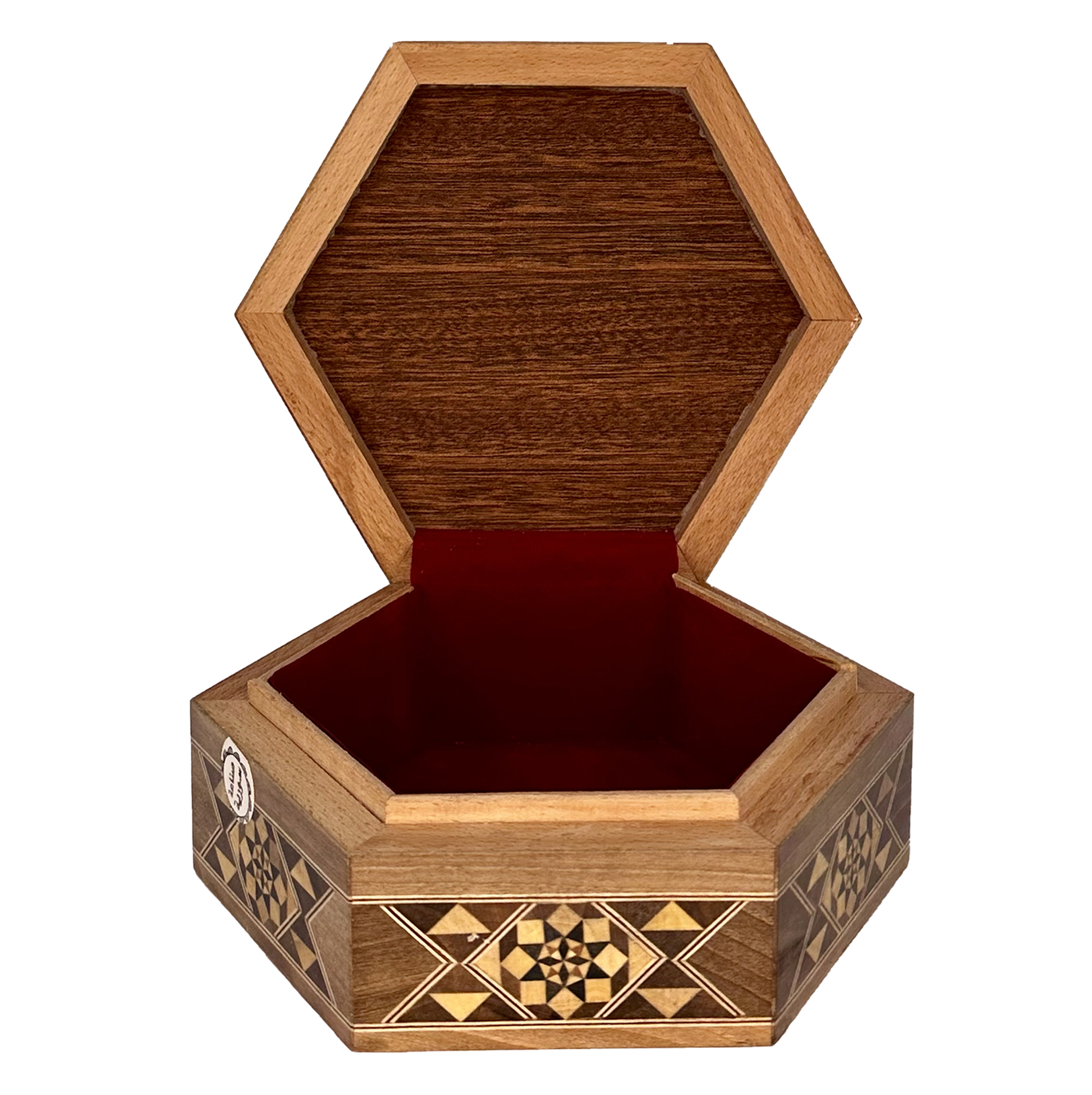 Les boîtes en mosaïque syriennes se déclinent en de nombreuses formes et tailles, chacune adaptée à un usage particulier. On trouve des boîtes à bijoux, souvent dotées de compartiments intérieurs et doublées de velours, des coffrets à jeux (comme ceux pour les échecs ou le backgammon), des boîtes à lettres, ou encore de petites boîtes décoratives destinées à contenir de l’encens ou des souvenirs. Les motifs varient aussi : certains sont géométriques et symétriques, d’autres reprennent des inspirations florales ou arabesques. Chaque boîte est unique, façonnée à la main, et reflète la richesse de l’artisanat damascène et le goût du détail propre à l’art oriental.