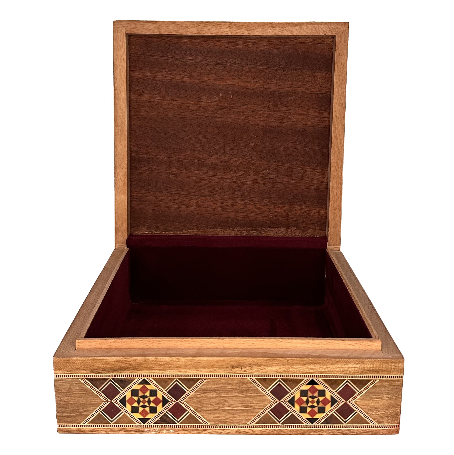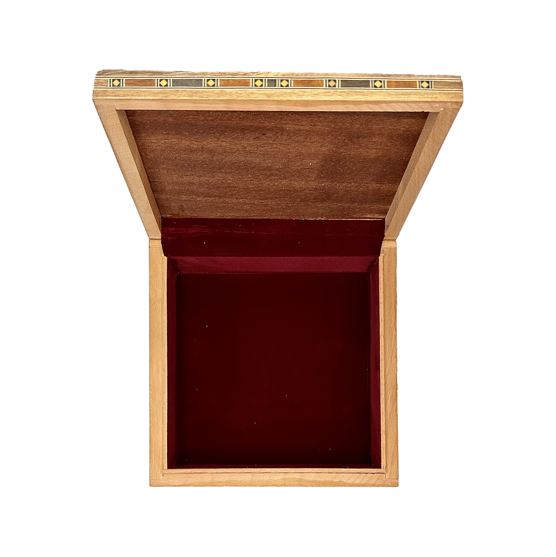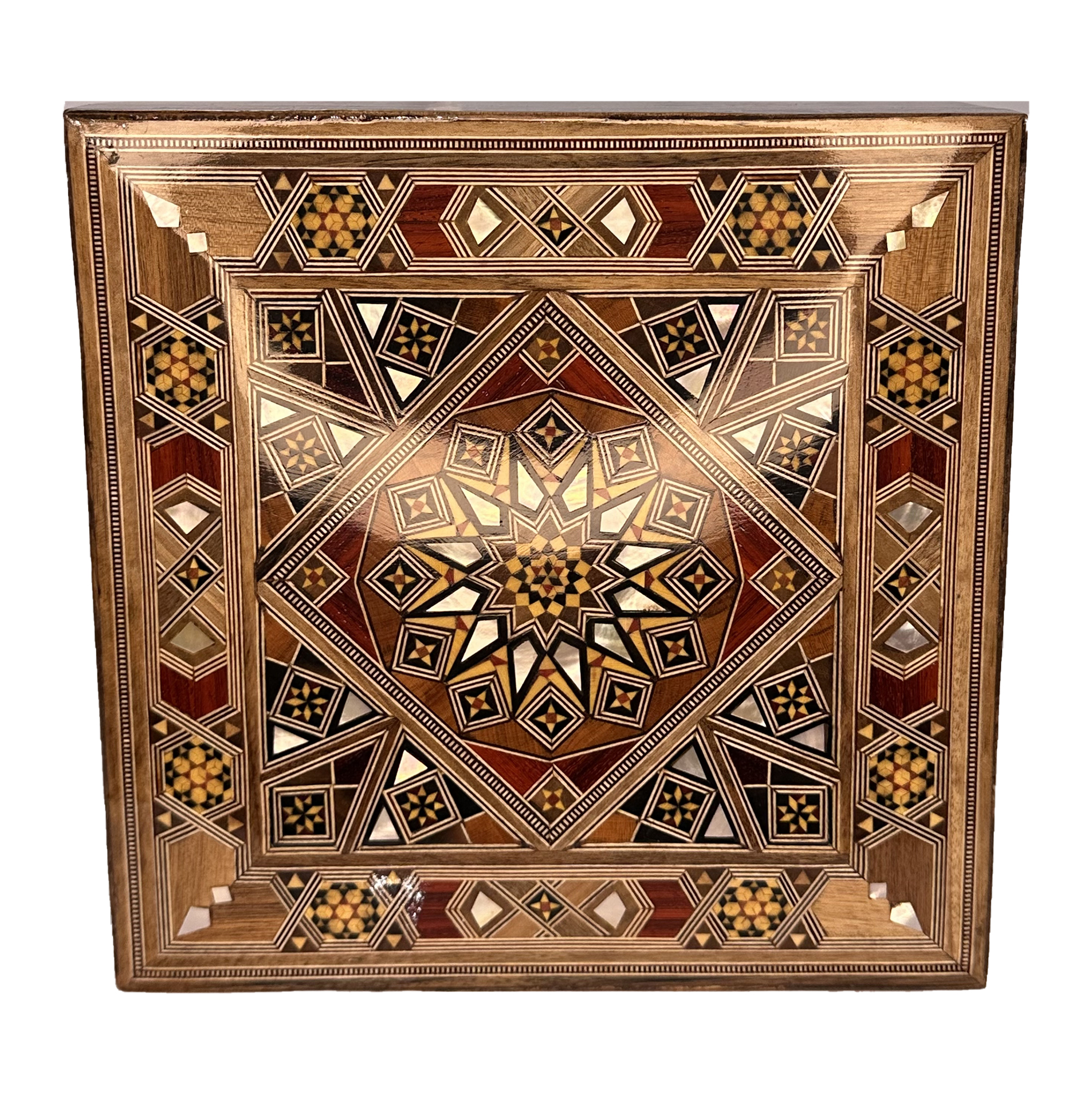 Les boîtes en mosaïque syriennes se déclinent en de nombreuses formes et tailles, chacune adaptée à un usage particulier. On trouve des boîtes à bijoux, souvent dotées de compartiments intérieurs et doublées de velours, des coffrets à jeux (comme ceux pour les échecs ou le backgammon), des boîtes à lettres, ou encore de petites boîtes décoratives destinées à contenir de l’encens ou des souvenirs. Les motifs varient aussi : certains sont géométriques et symétriques, d’autres reprennent des inspirations florales ou arabesques. Chaque boîte est unique, façonnée à la main, et reflète la richesse de l’artisanat damascène et le goût du détail propre à l’art oriental.